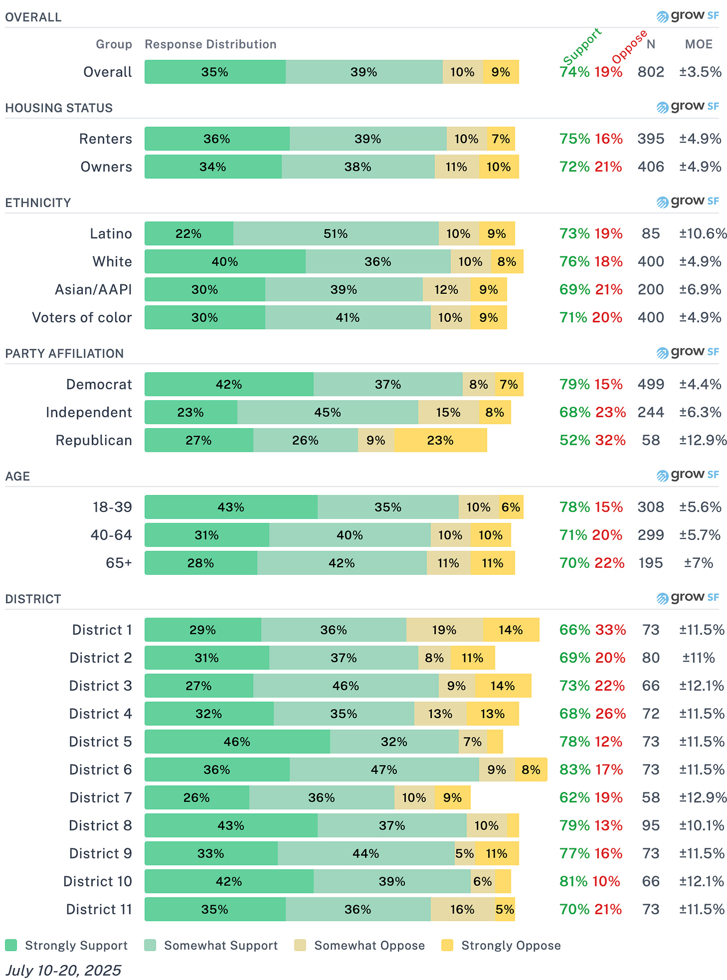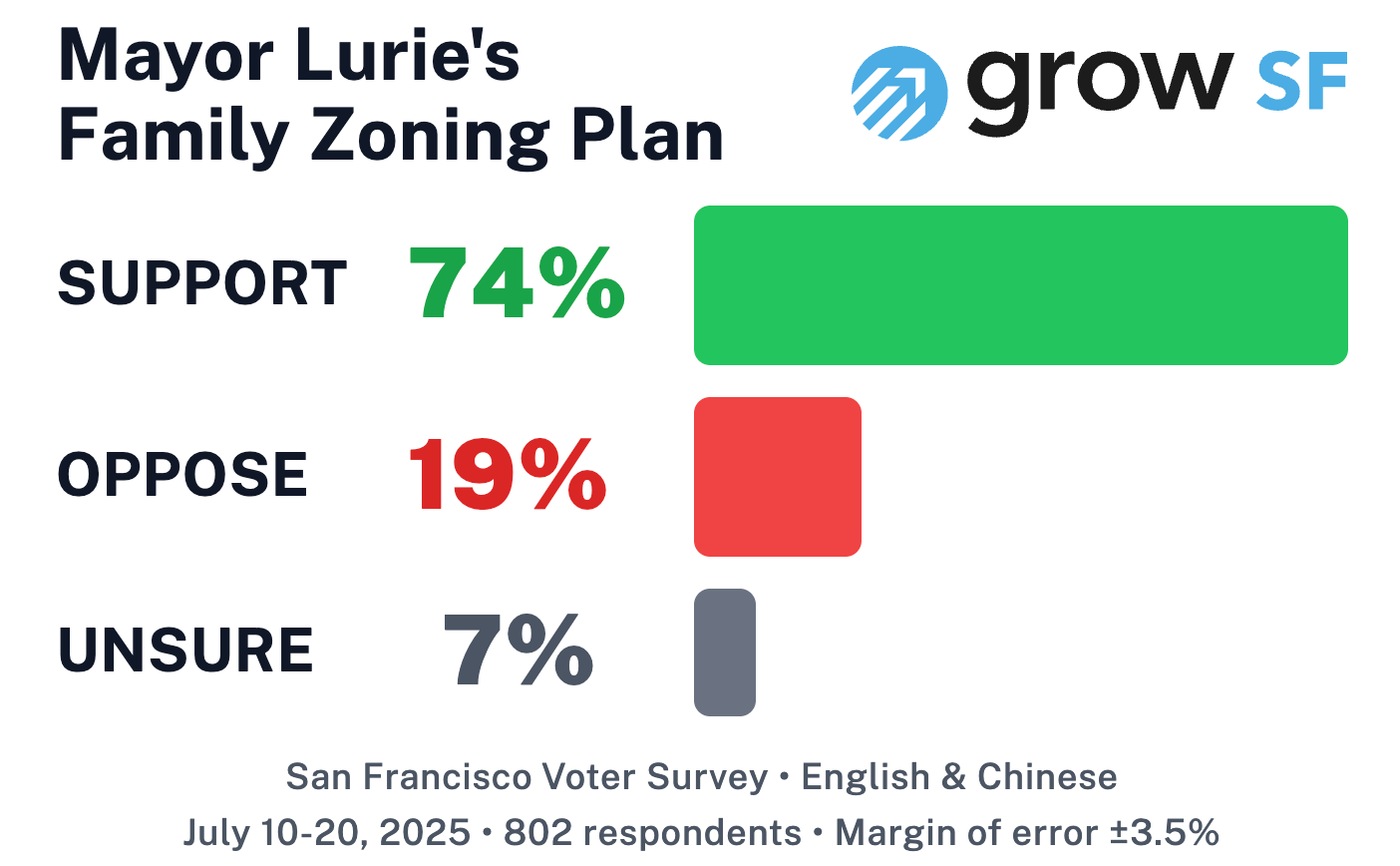 In July, 2025 we asked over 400 San Francisco voters how they felt about family zoning. With a margin of error of ±3.5%, we found 74% of people support the family zoning plan.
