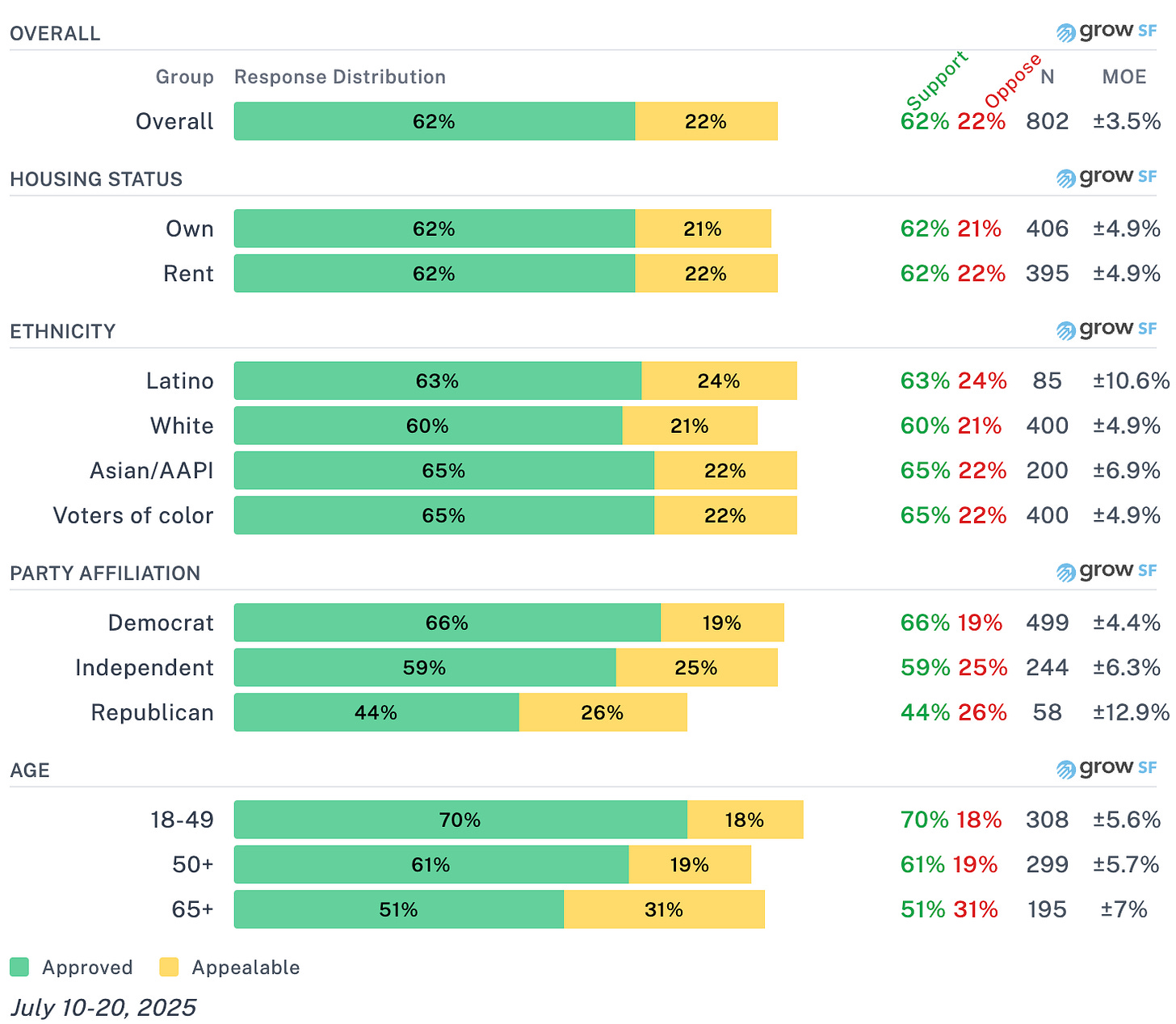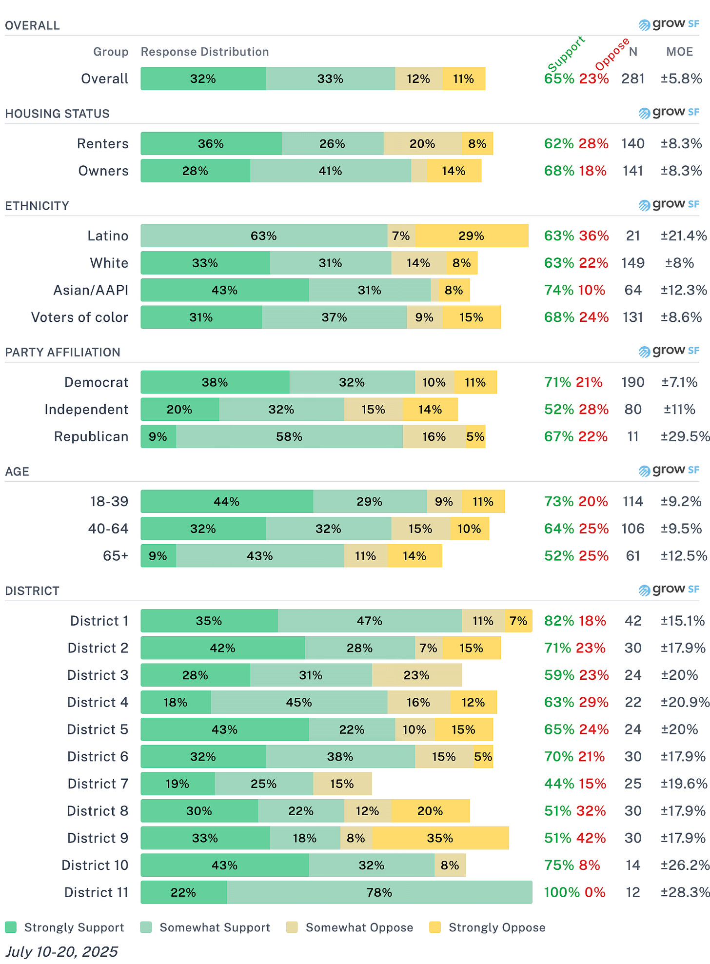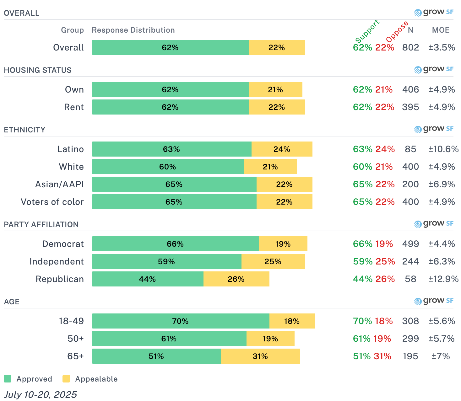 Now with Mayor Lurie's family zoning proposal on the table, we thought it was the right time to publicly disclose much more of our housing data. Below, you'll find our results and cross-tabs for the first time, and you'll see that housing is, in fact, super popular:
