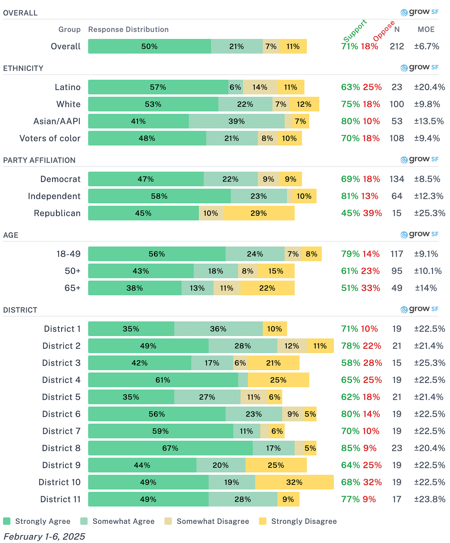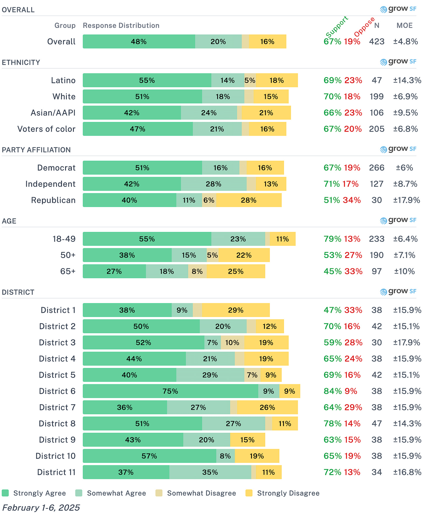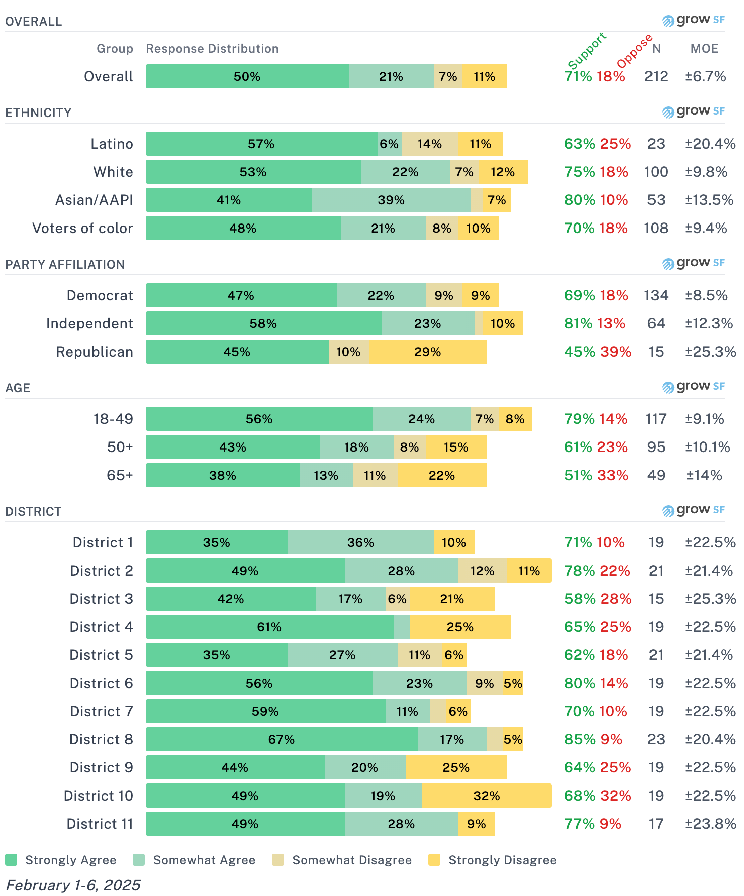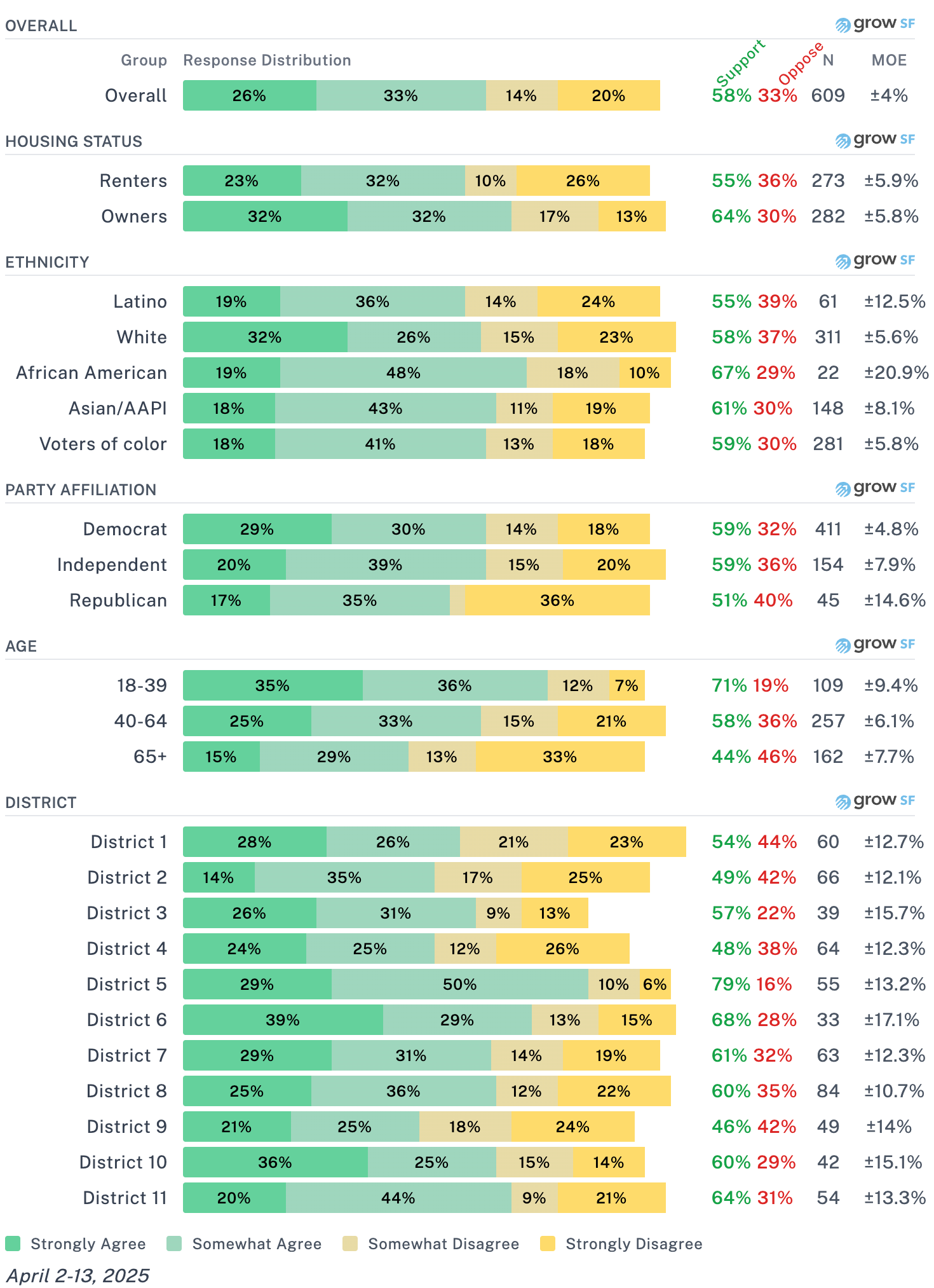 Now with Mayor Lurie's family zoning proposal on the table, we thought it was the right time to publicly disclose much more of our housing data. Below, you'll find our results and cross-tabs for the first time, and you'll see that housing is, in fact, super popular: