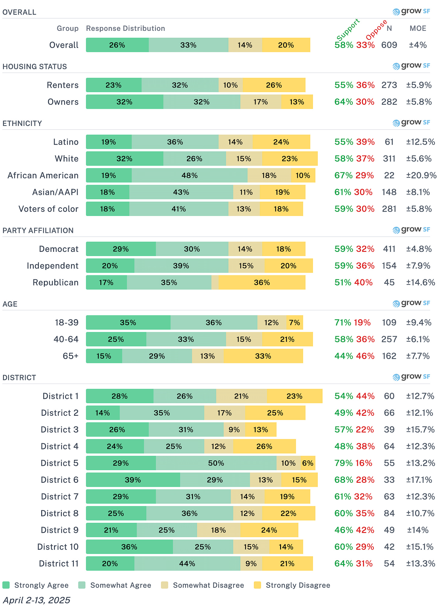 San Franciscans aren't afraid of tall buildings, despite what you may have heard. They want 20 story towers near BART stops and downtown and 6-8 stories along major streets. The major determinant of support is age - young people are wildly supportive, and 65+ only somewhat.