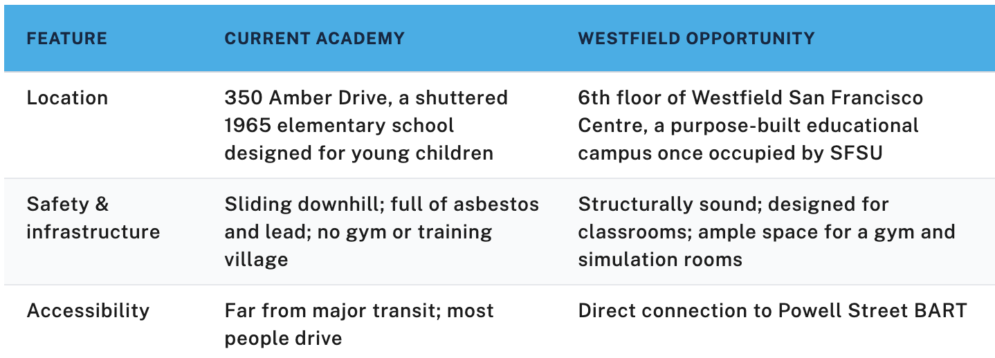 A move to Westfield would not just fix the academy’s deficiencies; it would make the program more accessible and appealing to recruits from across the region given the connection to BART, as well as make the SFPD Academy a home training facility for other regional agencies.