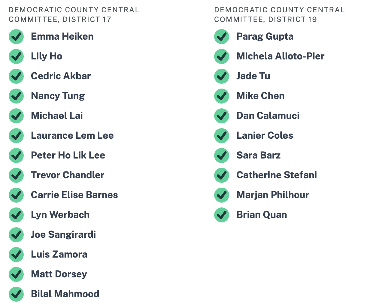 For the Democratic County Central Committee, the most important election on the ballot, we endorse these common-sense candidates. If youโre in Assembly District 17, use the list on the left; if youโre in Assembly District 19, use the list on the right. You can look up your district here. On your ballot, vote for all candidates listed.